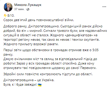 Утро доброе, потому что мирное: Лукашук рассказал о ситуации на Днепропетровщине