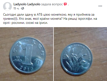 В одном из супермаркетов сети АТБ днепрянке дали сдачу монетами. Девушка пришла домой и увидела среди них неукраинскую. Впоследствии оказалось, что это китайская монета цзяо.