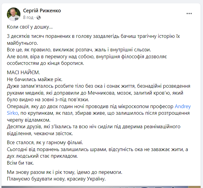 От ранений остались шрамы, отсутствие глаз не мешает жить, а дух человеческий становится примером. Всем бы так. Мы снова вместе, как и год назад, идем к победе. Планируем строить новую, красивую Украину, – дополнил врач.