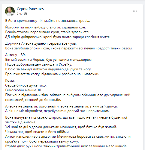 В его теле почти не осталось крови… Его жизнь после взрыва стала как страшный сон. Реаниматологи переливали кровь, стабилизировали состояние. 8,5 литров днепровской крови было влито ради спасения жизни. Жена Алена душой и сердцем все чувствовала. Она потеряла покой и сон, и хочет пережить все печали и радости только вместе… Кома. Сердце билось очень тихо. Гемоглобин меньше 30. Истерзанное обломками тело, обожженное взрывом лицо, но дух украинский – несокрушимый, готовый к борьбе. Алена не знала, как его найти, она не знала, как с ним связаться. А он не мог ответить, находясь долгое время без сознания. Она чувствовала под своей кожей, что все пошло не так, и ждала любого известия от Антона. Все ночи и дни с двумя дочерями молились, чтобы отец был жив, – написал врач.