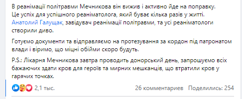 Антон настойчиво с врачами Мечникова боролся за свою жизнь, истекая кровью с поля боя, пережив тяжелую кому. Утрата двух рук и ноги, тяжелый травматический шок оставляли мало шансов. В реанимации политравмы он выжил и активно идет на поправку… Готовим документы и отправляем на протезирование за границу под патронатом власти и верим, что крепкие объятия скоро будут, – написал генеральный директор.