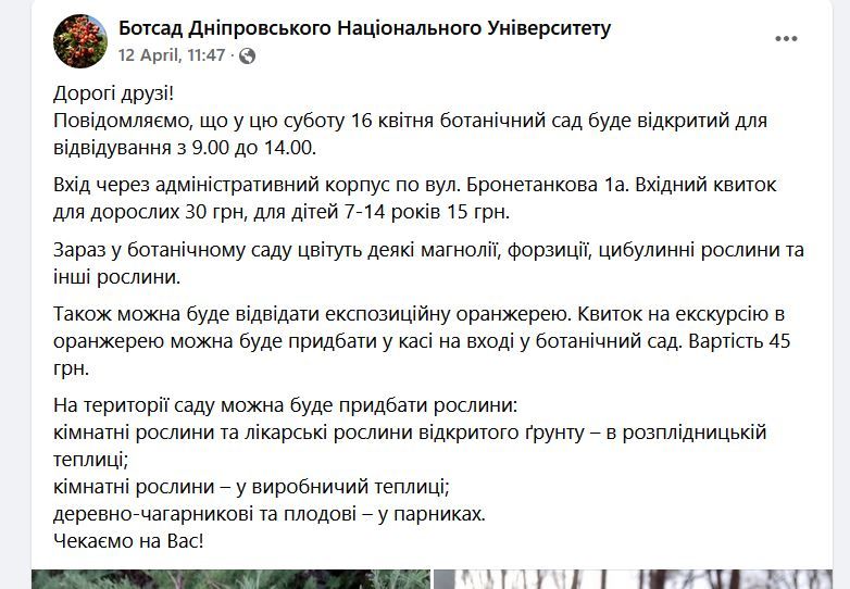 16 апреля ботсад будет снова принимать посетителей с 9:00 до 14:00. Вход через административный корпус по улице Бронетанковая, 1а. Билет для взрослых стоит 30 гривен, а для детей 7-14 лет - 15 гривен.