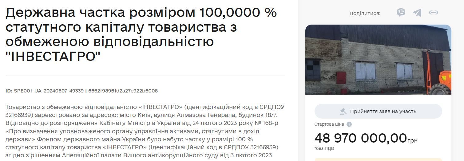 28 июня Фонд государственного имущества проведет онлайн-аукцион по продаже национализированной агрокомпании "ИНВЕСТАГРО".