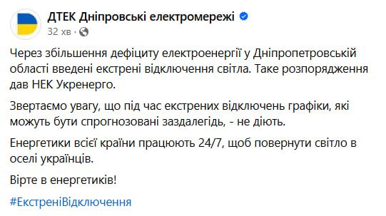На странице Facebook ДТЭК Днепровские электросети объявили о распоряжении от Укрэнерго – вводе экстренных отключений света.