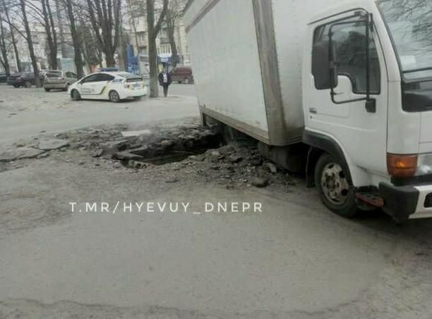 На улице Титова заднее колесо грузового автомобиля Nissan провалилось в образовавшуюся яму. По предварительной информации, под асфальтом разрушилась плита перекрытия над теплотрассой, из-за чего и образовалась «ловушка».