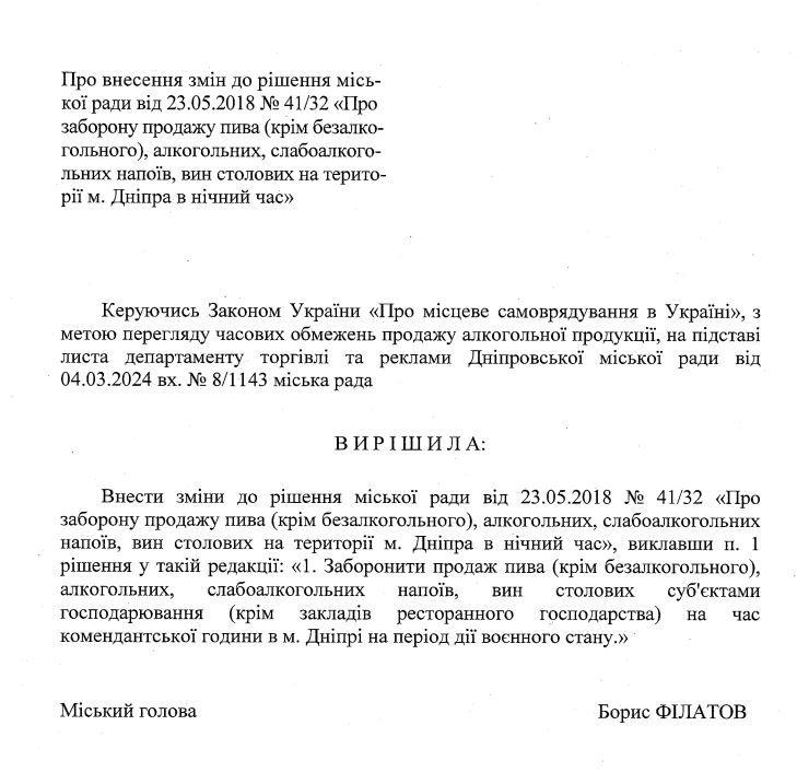 Запретить продажу пива (кроме безалкогольного), алкогольных слабоалкогольных напитков, столовых вин субъектами хозяйствования (кроме заведений ресторанного хозяйства) на время комендантского часа в Днепре на период действия военного положения, — указано в документе.