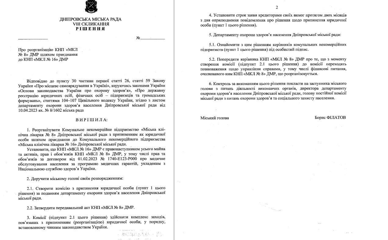 Больница №16 станет правопреемницей всех активов, имущества, обязанностей и услуг. Включая договор о медицинском обслуживании населения, заключенный с НСЗУ. Таким образом, к ней перейдут все юридические и финансовые полномочия. Для этого специальная комиссия должна предпринять все необходимые для реорганизации шаги.