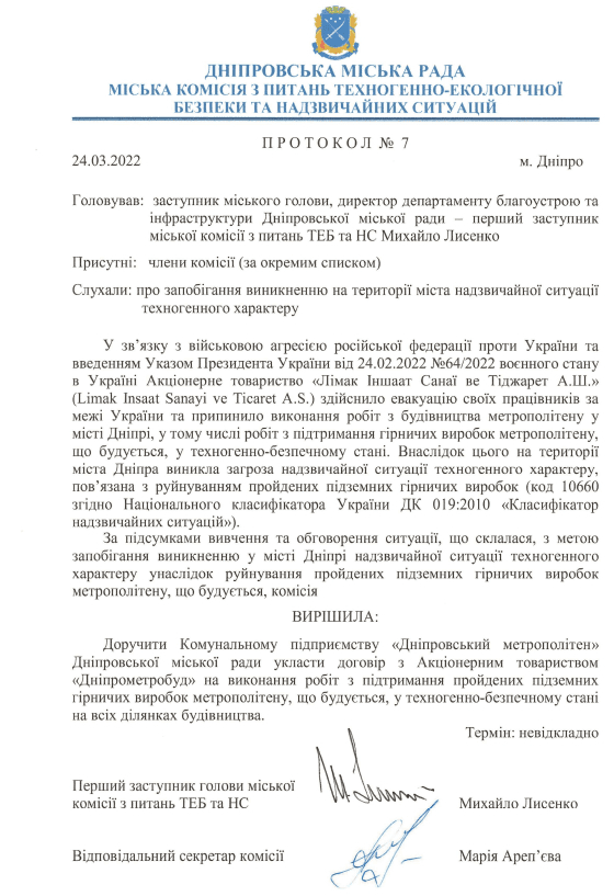 В протоколе отмечено, что КП «Днепровский метрополитен» заключит договор с АО «Днепрометрострой» на выполнение работ и поддержку горных выработок метрополитена, чтобы сохранить техногенную безопасность города.