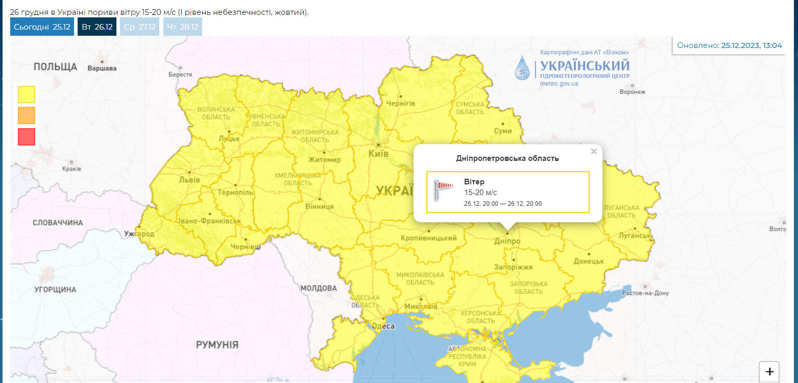 Синоптики Украинского гидрометеорологического центра на вторник, 26 декабря, объявили штормовое предупреждение по всей Украине, в том числе в Днепре и области. Ожидается сильный ветер – порывы 15-20 м/с. Уровень опасности – первый, желтый.