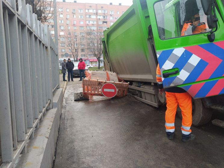 Инцидент произошел, когда мусоровоз пытался заехать во двор многоэтажки, сообщает Depo.Дніпро. По всей видимости, сначала грузовик проехал нормально, а вот под задними колесами асфальт провалился.