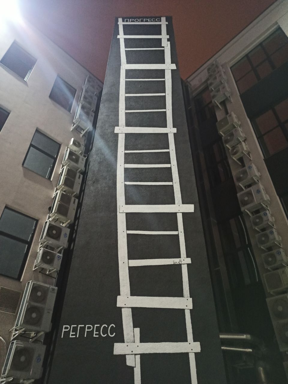 Их сопровождают философские подписи: «Фундаментальная неустойчивость пьедестала», «Риба не вміє падати. Ми – теж», «Регресс-прогресс».