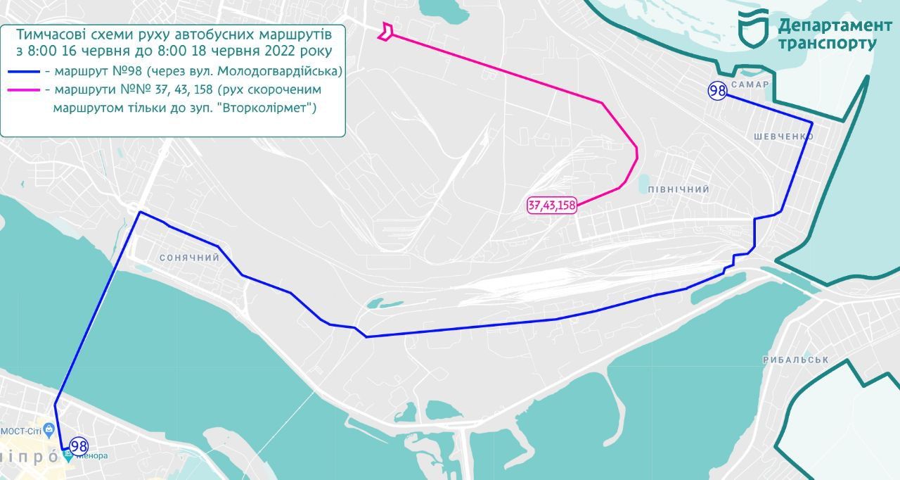 - №98 будет курсировать измененным маршрутом от проспекта Слобожанский через улицу Любарского, Малогвардейскую, Самарский узвоз до улицы Иларионовской и дальше по маршруту до поселка Шевченко.