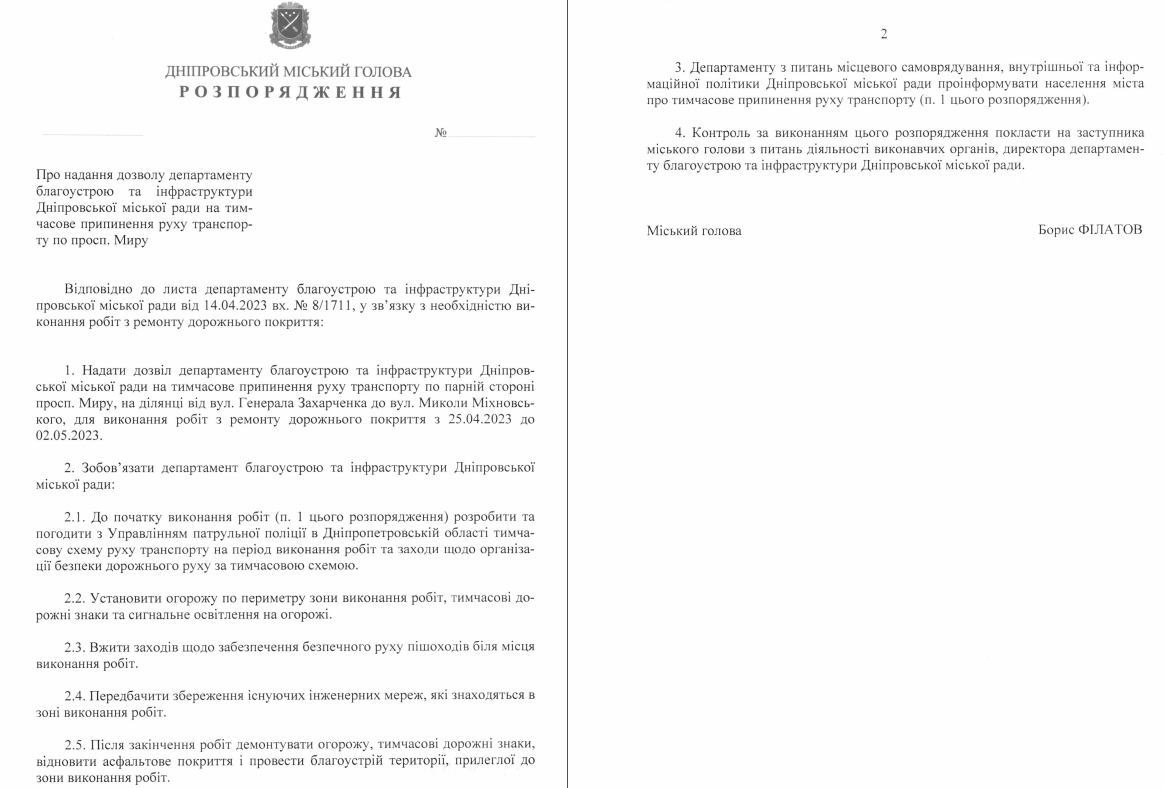 Об этом говорится в проекте распоряжения, опубликованном на сайте Днепровского горсовета.
