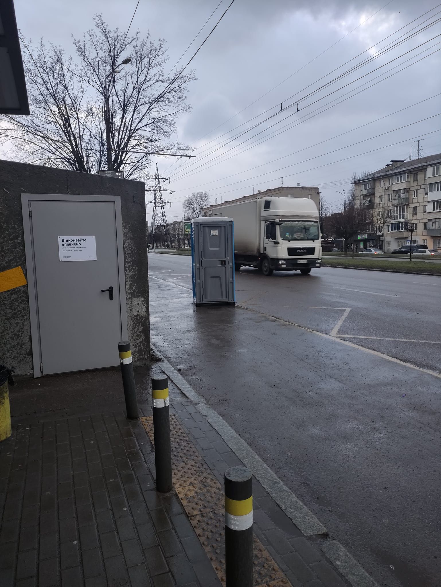 Отметим, биотуалет установили возле укрытия на остановке общественного транспорта, но ветер был такой силы, что он временно "сменил прописку".