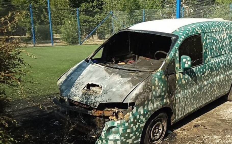 После этого горожане распространили информацию, что неподалеку от места, где предварительно загорелся ВАЗ, произошло возгорание другого авто, и обнародовали фото, на котором видна поврежденная огнем передняя часть микроавтобуса.