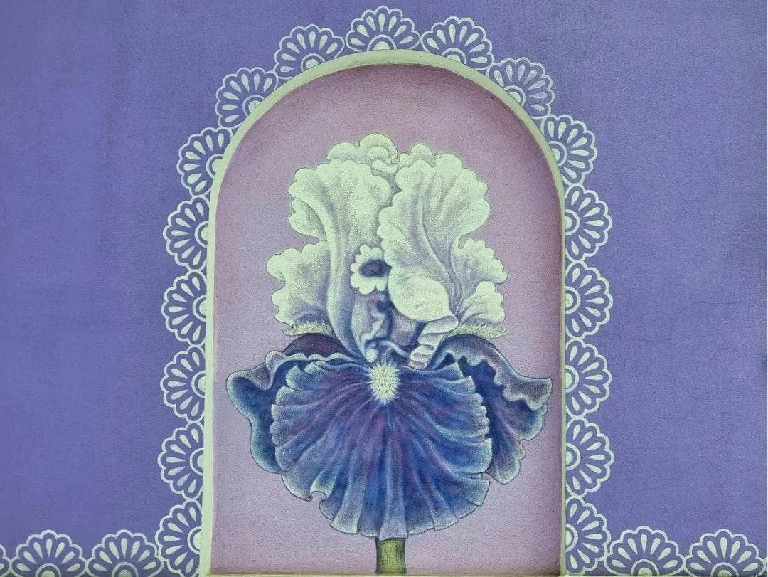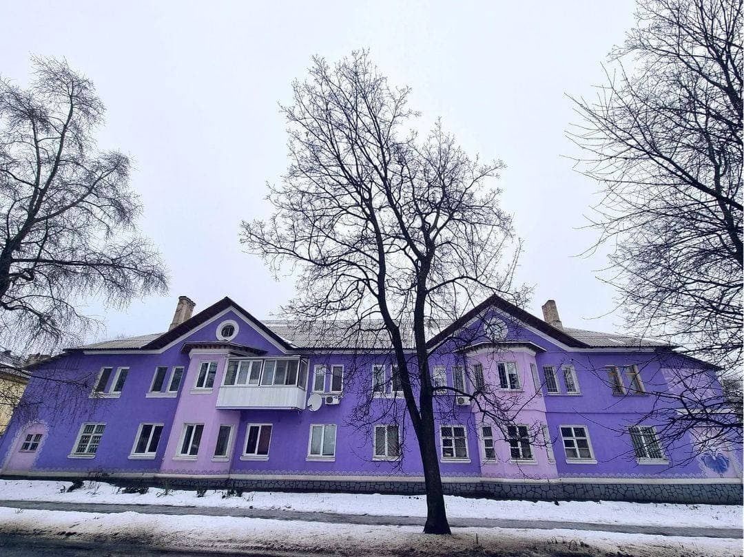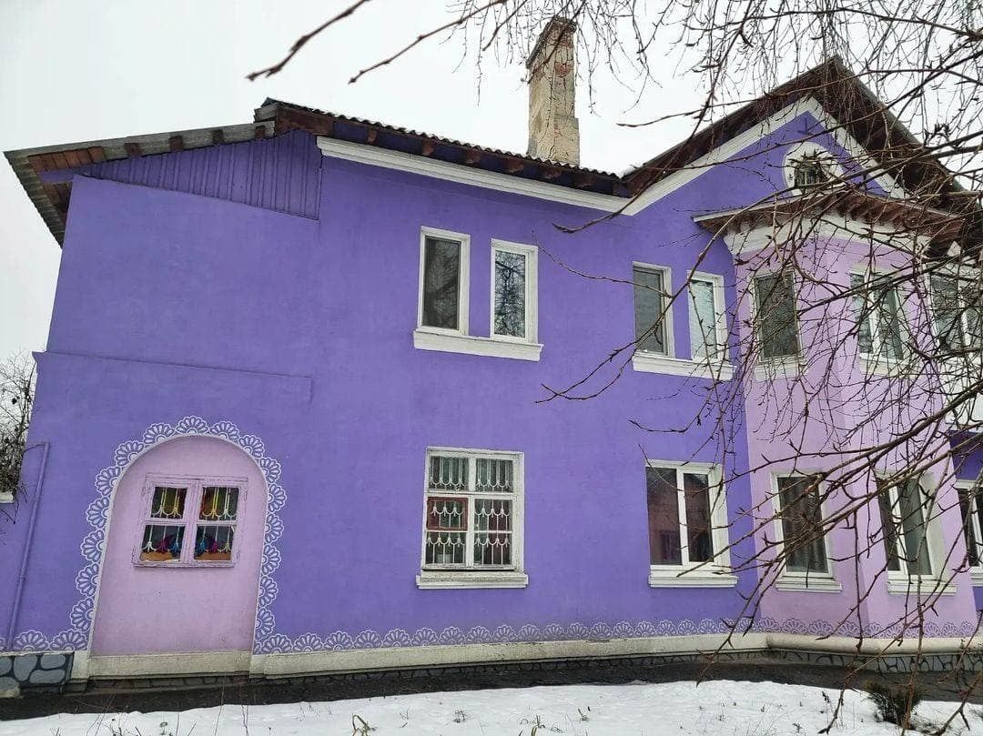 Первое, что бросается в глаза, - это фиолетовый цвет фасада и рисунки на нем.