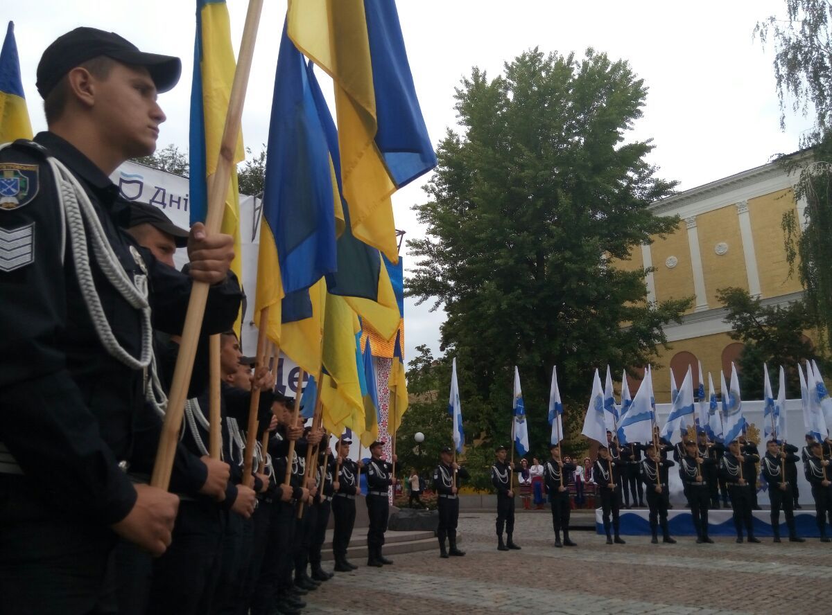 После торжественных представлений на площадь под гимн Украины студенты университета внутренних дел Днепра вынесли флаги Украины и Днепра. После торжественного внесения символов государства и города была проведена минута молчания в память о погибших во время военных действий бойцах.