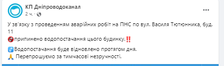 Кроме того, аварийные работы проводятся на ПНС по ул. Василия Тютюнника, 11. Поэтому прекращено водоснабжение этого дома.