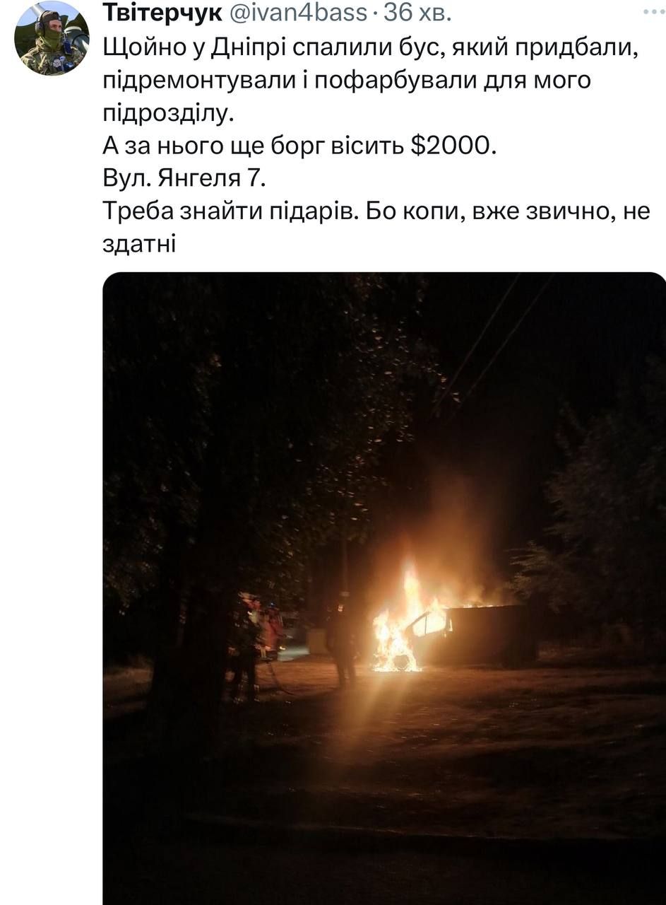 В Днепре ночью сожгли только что отремонтированный бус военных