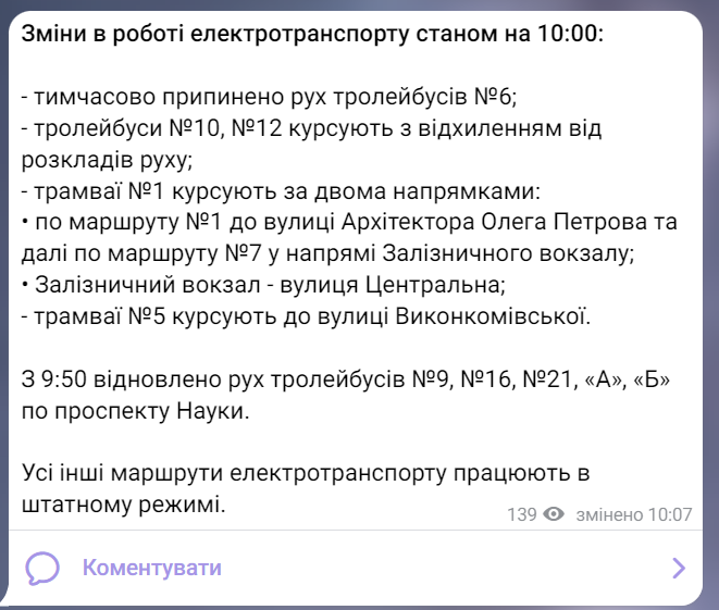 Обновлено: изменения в работе электротранспорта по состоянию на 10:00: