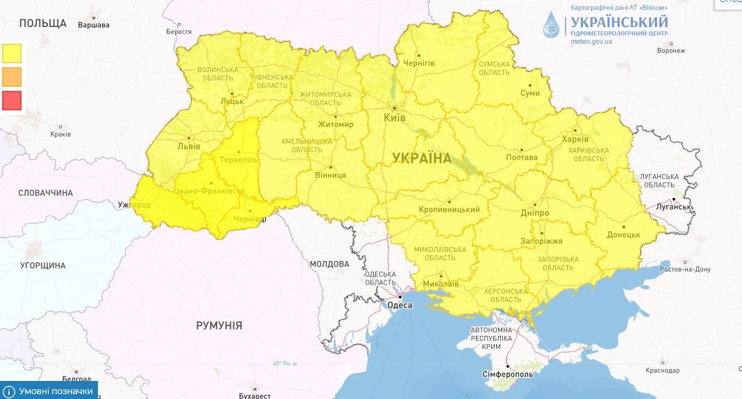 Ночью в большинстве западных, северных и центральных областей, днем на Левобережье грозы; ночью в Закарпатье и Прикарпатье, днем в Днепропетровской, Донецкой и Запорожской областях значительные дожди (И уровень опасности, желтый).