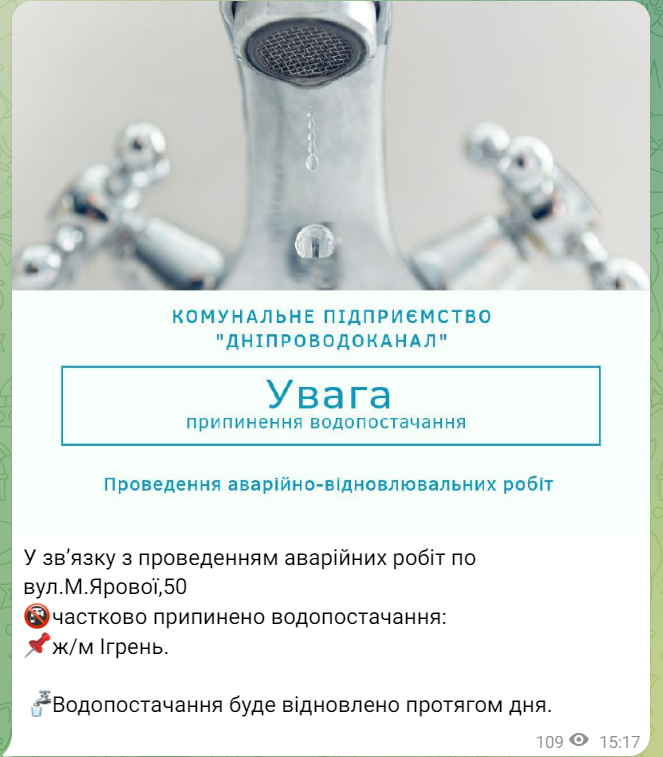 Сегодня, 11 октября, в Днепре жилмассив Игрень частично отключили от водоснабжения.
