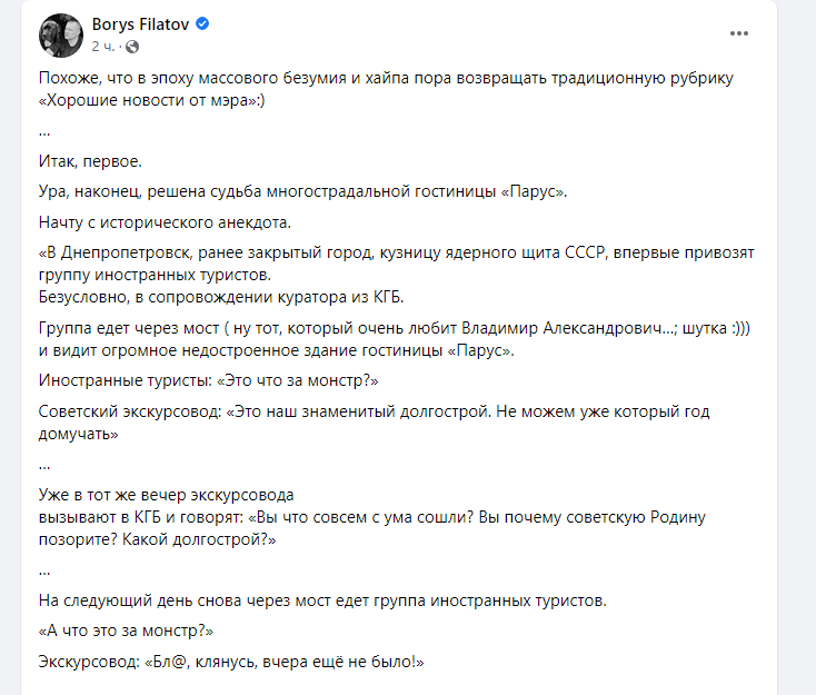 Об этом рассказал мэр Днепра Борис Филатов на своей странице в Facebook.