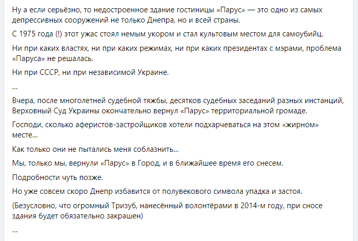 По его словам, после многолетней судебной тяжбы, здание наконец вернули в собственность города, поэтому долгострой вскоре снесут. Когда именно Днепр избавится от Паруса, пока что неизвестно. Ранее, глава Общественного совета при Днепровском горсовете Геннадий Корбан говорил, что на месте гостиницы хотят построить целый комплекс. Здесь появятся пару знаковых объектов и Unit.City (такой есть в Киеве). Это огромный инвестиционный парк с единой концепцией, большим паркингом, музеями, бизнес-школами и тд.