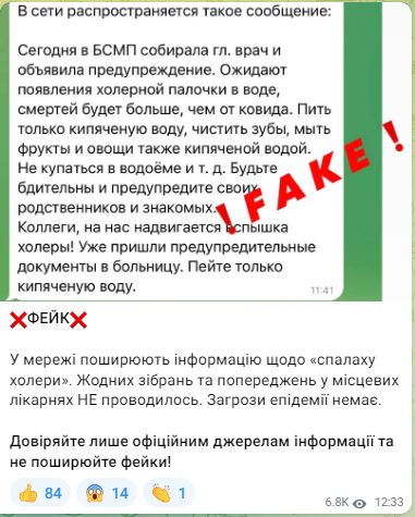 Так, в некоторых Telegram-каналах пишут, что в Днепре ожидается эпидемия холеры. Эту страшную весть якобы принесла главврач одной из больниц. Утверждается, что в воде появится холерная палочка и «смертей будет больше, чем от ковида».