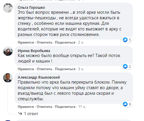 Горожане отмечают, что арка в этом дворе была закрыта долгое время. Сейчас здесь проезд открыли. Но днепряне отмечают, что ее надо закрыть снова, потому что подобные инциденты могут случится и в будущем.