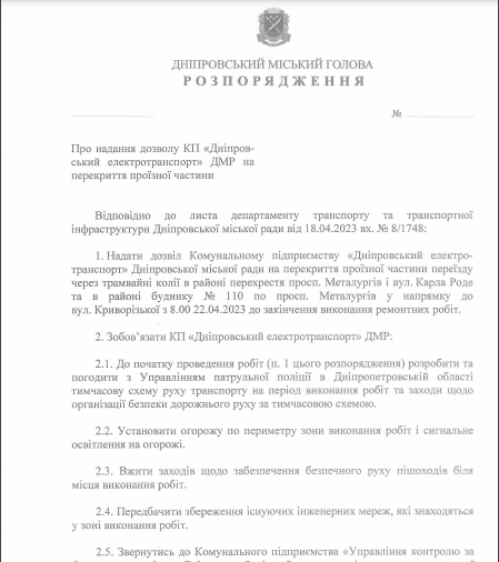 Причина – ремонт, который будет проводить КП "Днепровский электротранспорт". Перекрытие продлится с 8:00 22 апреля до завершения работ.