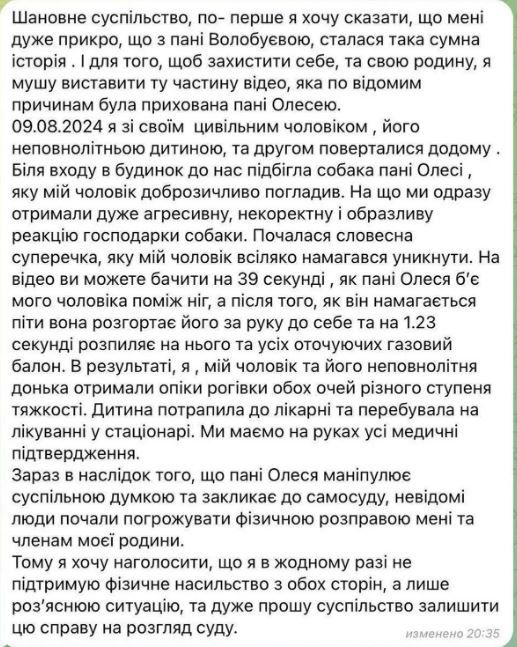 Уважаемое общество, во-первых, я хочу сказать, что мне очень досадно, что с госпожой Волобуевой произошла такая печальная история. И для того, чтобы защитить себя и свою семью, я должен выставить ту часть видео, которая по известным причинам была скрыта Олесей, – пишет женщина.
