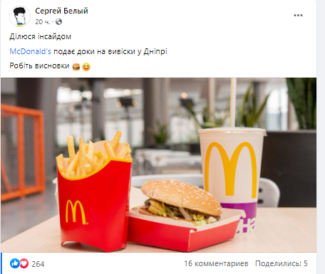 Делюсь инсайдом. McDonald's подает доки на вывески в Днепре. Делайте выводы, – написал Сергей Белый.