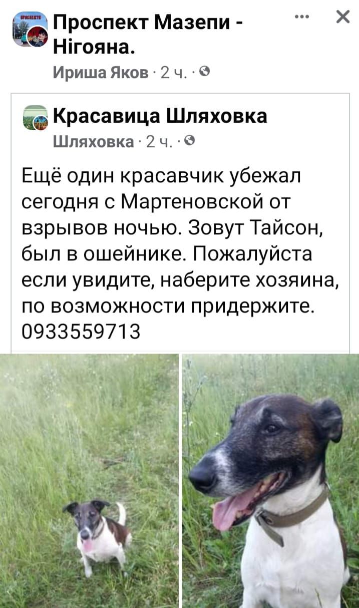 Днепрянка Оксана сообщает, что на Клочко из дома во время взрывов сбежал пес, которого зовут Лорд.