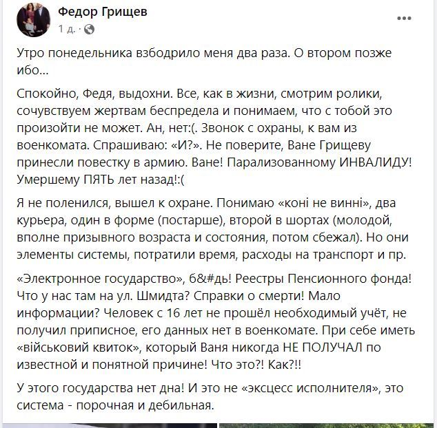 Что там у нас на улице Шмидта? Справки о смерти! Мало информации? Человек с 16 лет не прошел требуемый учет, не получил приписное, его данных нет в военкомате. При себе иметь «военный билет», который Ваня никогда не получил по известной и понятной причине! Что это?! Как?!!», – пишет Федор Грищев.