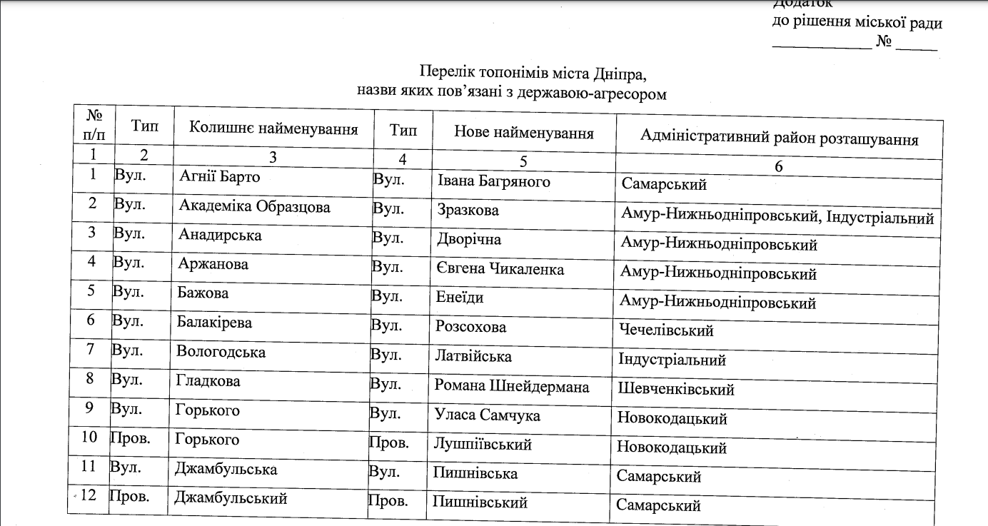 Так, улицу Агнии Барто планируют переименовать в улицу Ивана Багряного; улицу Академика Образцова – в улицу Образцовую; улицу Бажова – в улицу Энеиды; улицу Гладкова – в улицу Романа Шнейдермана; улицу Лермонтова в АНД районе – в улицу Маруси Чурай; тупик Толстого – в тупик Кометы: улицу Каверина – в улицу Профессора Герасюты и т.д.