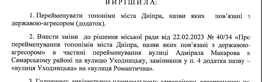 Следует отметить, что отдельный пункт проекта решения касается бывшей улицы Адмирала Макарова в Самарском районе Днепра. 22 февраля 2023 года ее переименовали в Уходницкую. Теперь же название предлагают повторно изменить: с Уходницкой – на Романтическую.
