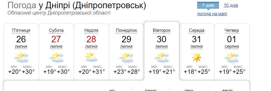 В это трудно поверить, но в Днепре ожидается значительное похолодание. После жары, которая еще продержится в выходные, во вторник, 30 июля, температура воздуха опустится до +20. Этому будут предшествовать ливни и грозы, которые накроют город 29 июля.