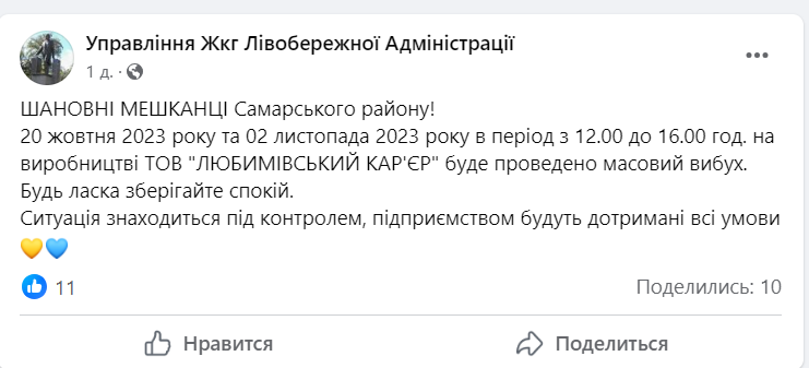 Сегодня, 20 октября, в Днепре в период с 12:00 до 16:00 на производстве ООО "ЛЮБИМОВСКИЙ КАРЬЕР" будет произведен массированный взрыв.