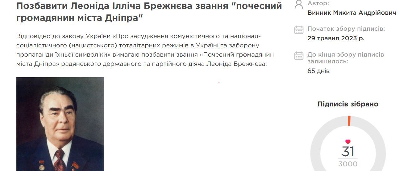 Днепрянин создал петицию с просьбой лишить Брежнева звание почетного гражданина Днепропетровска.