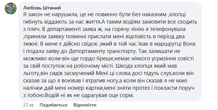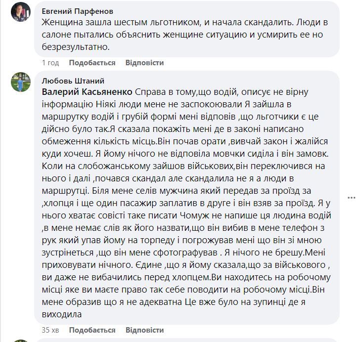 В свою очередь Любовь отметила, что конфликт с водителем действительно был, так как пассажирка тоже хотела проехать как льготник. На что водитель отреагировал грубо и потребовал заплатить на проезд, ведь, по его мнению, в салоне уже было достаточно занятых льготных мест.