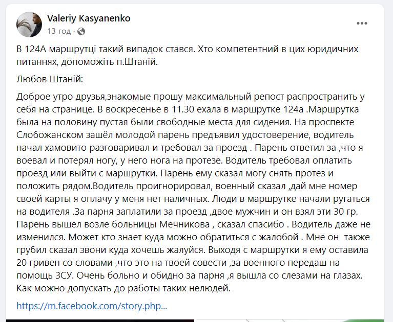Двое неравнодушных заплатили за проезд военного и водитель взял эти 30 грн. Вышел он возле больницы Мечникова, поблагодарив, – пишет женщина.