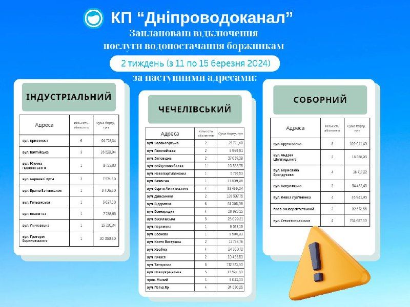 В Днепре с понедельника будут отключать воду за долги в 3 районах: перечень адресов