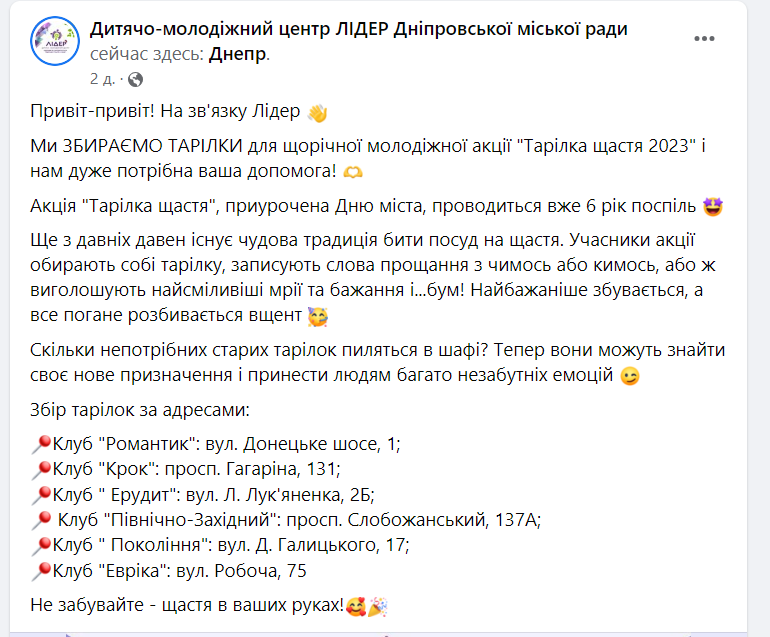 В Днепре собирают старые ненужные тарелки для ежегодной молодежной акции "Тарелка счастья 2023".