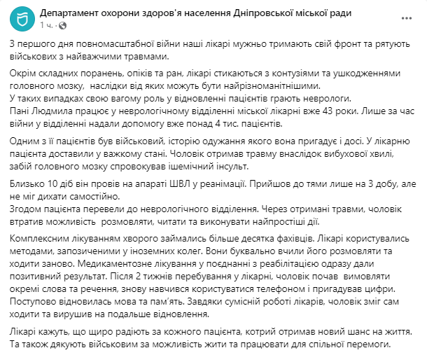 В Днепре спасали воина, который из-за ранений забыл как говорить и читать