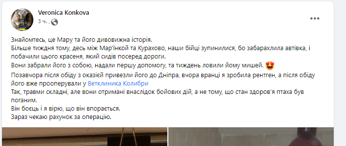 Совенка назвали Мару. Ветеринары сказали, что у него серьезные травмы, которые он получил в результате боевых действий, однако общее состояние здоровья птицы удовлетворительное. Вероника верит, что боец Мару справится и полностью поправится.