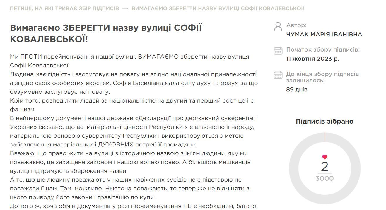 Мы против переименования нашей улицы. Требуем сохранить название улицы Софии Ковалевской. Человек имеет достоинство и заслуживает уважения не по национальной принадлежности, а по своим личным качествам. Софья Васильевна имела силу духа и разум за что безусловно заслуживает уважения. Кроме того, распределять людей по национальности на второй и первый сорт это и есть фашизм, - говорится в тексте обращения.