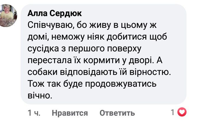 Алла Сердюк, которая живет в этом доме, отметила, что собак подкармливает "соседка с первого этажа", поэтому они и поселились во дворе.