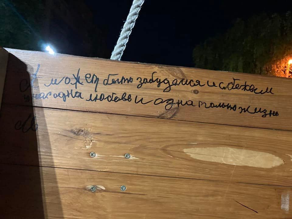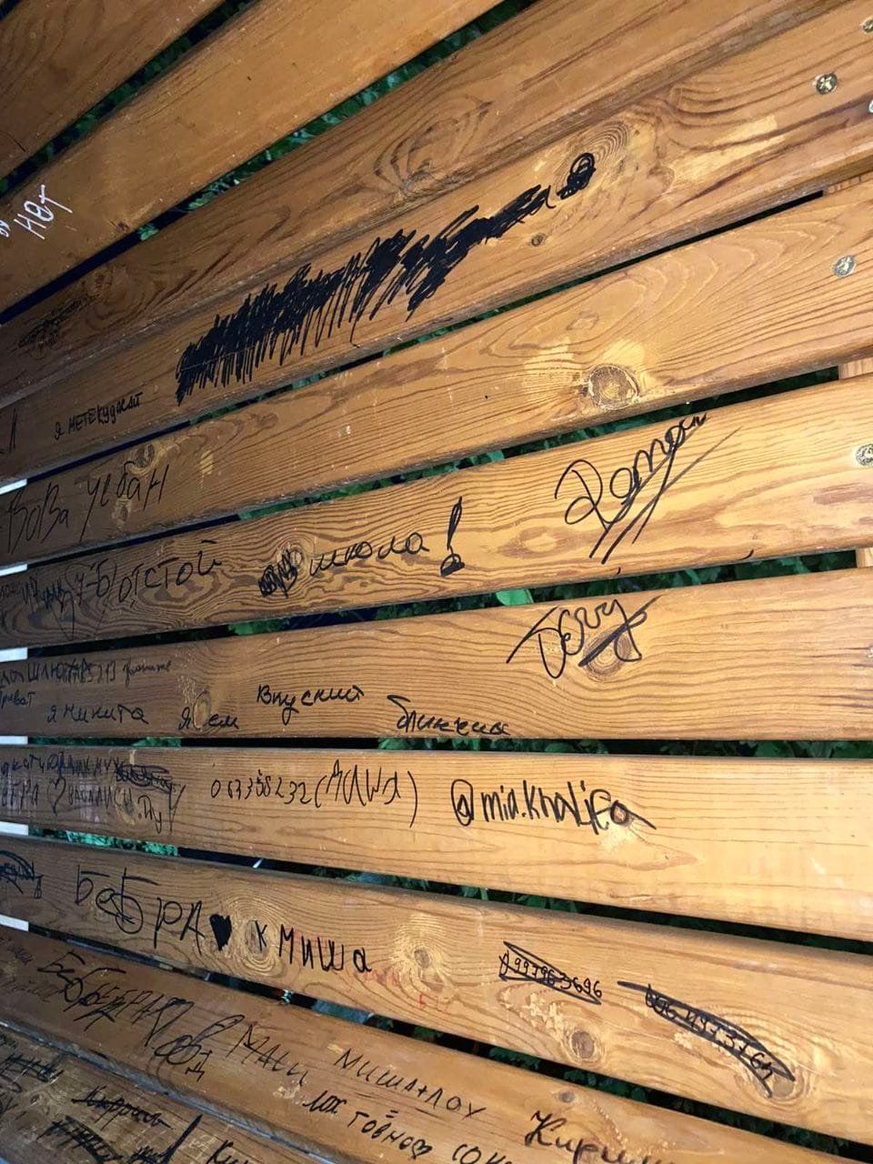 "Этот "жизненный цикл" прошел каждый новый сквер и у нас на Райончике... Так было в сквере Усачёва, в сквере на Слобожанском, даже в маленьком сквере Кубик. Как только сквер готов, посетители начинают его ломать и обрисовывать. Потом обычно чинят и отмывают эту наскальную живопись. Дальше вандалы немного успокаиваются, и сквер начинает существовать в спокойном режиме. Но вот этот этап, пока все разрисовывают и рушат, очень расстраивает", - написала Ольга и опубликовала фото.