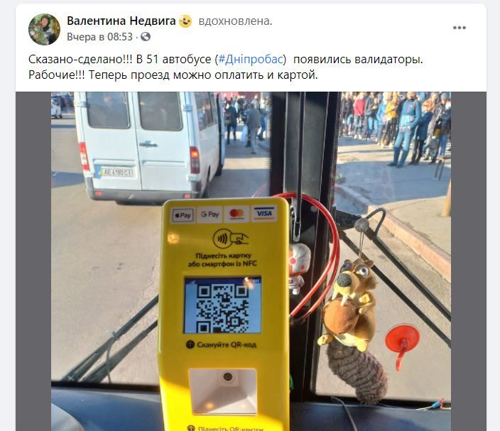 "Сказано - сделано. В автобусе (Дніпробас) появились валидаторы. Рабочие! Теперь проезд можно оплатить и картой, - написала днепрянка.